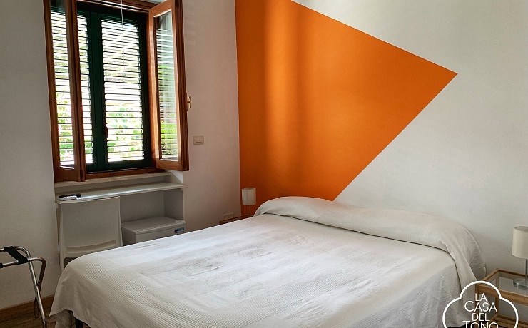 Una camera dall’atmosfera tradizionale, ampia e fresca, dal soffitto alto, affacciata sul giardino mediterraneo.
