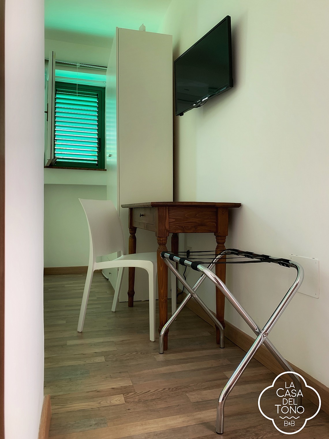 The most intimate and silent room, immersed in the quiet of Mediterranean garden of the ancient house. Fully furnished and equipped with tv, mini fridge and air conditioning, it accommodates two guests. It is provided with a private internal bathroom, also accessible to pepole with reduced mobility.